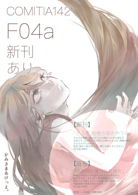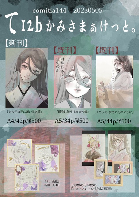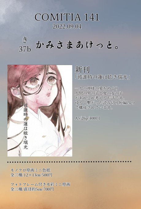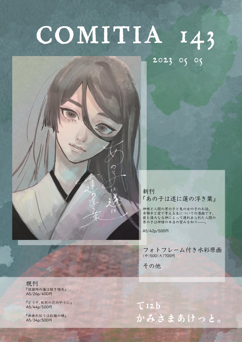 #COMITIA144 お品書きでました! 5月5日コミティア144(東京ビックサイト)に参加させていただきます! スペースナンバー:て-12b サークル名:かみさまぁけっと。 新刊『あの子は遂に蓮の浮き葉』 本文42p/500円 水彩原画や色紙なども持っていけたらと思っています! リプにサンプル