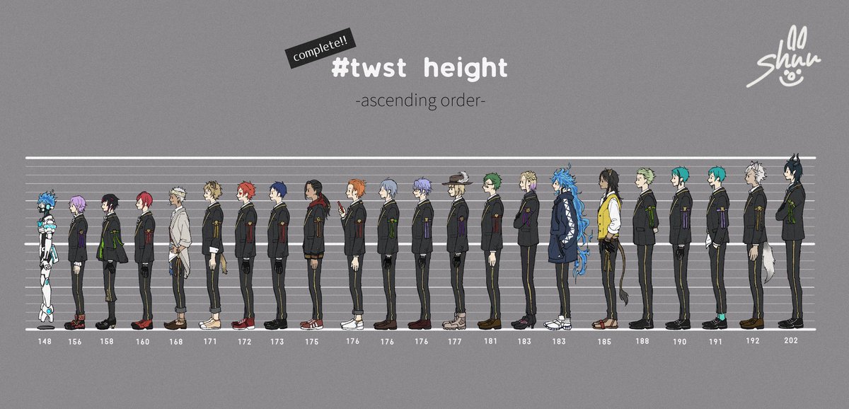 115 579 ツイステみんなの身長🌱 昇順Ver.です #ツイステファンアート 20/05/24 16:17