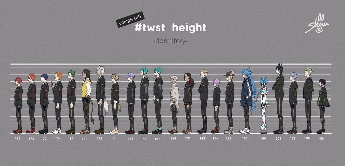 みんな揃った〜🙌 ツイステみんなの身長🌱 ※マレ様はツノ込み測定解釈です🙇 #ツイステファンアート