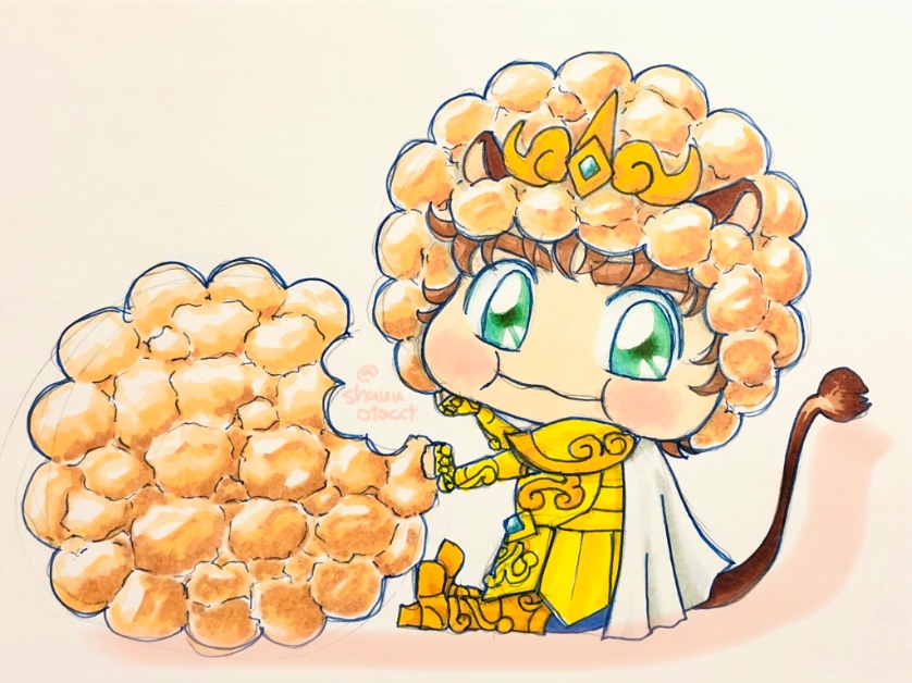 ぼんち揚のパッケージにいる「ぼんちネコ」を見るたび、描いてみたくてうずうずしてました!やっと描けた!! もぐもぐぼんちアイオリア🦁💗 なぜ聖衣正装にしてしまったのか…自分でもよく分かりません😅 ぼんち揚とかぶりもの(?)の色塗りがんばった😊 twitter.com/shuuuotacct/st…