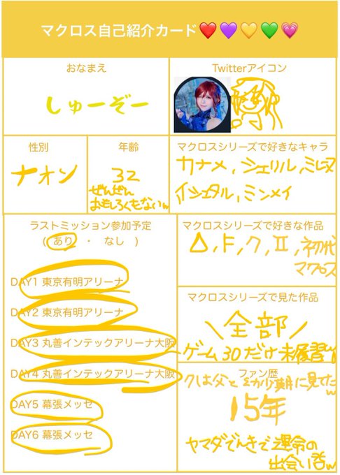 #マクロス自己紹介カード そして!!!念願のプロフ帳やっと書けた🥹💛 文字入れるのめんどすぎて名前以外読ませる気のないきったねえ字で手書きしてしまった😂対ょろです🥹💛(笑) twitter.com/shuzo_cos/stat…