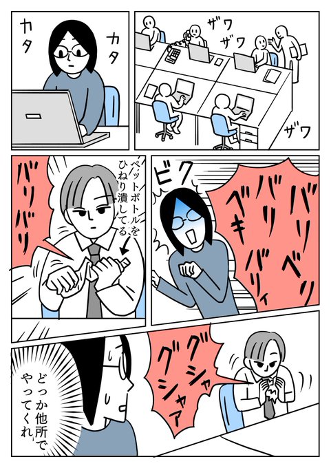 前の職場で、飲み終わった水のペットボトルを潰す人がいたんですけど、結構うるさいんですよね~。 #絵日記