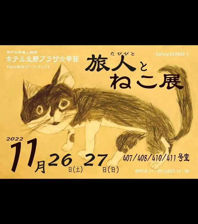 #旅人とねこ展 GalleryGEORGE+ 展示部屋は 407 408 410 411号室の4部屋 #ホテル北野プラザ六甲荘 65周年記念 【28室のGALLERY】 日時 2022年11/26(土)、11/27(日) 11:00~19:00 入場料 1000円 場所 ホテル北野プラザ六甲荘 神戸市中央区北野町1-1-14 公式サイト atartkobe-rokkoso.com #アート