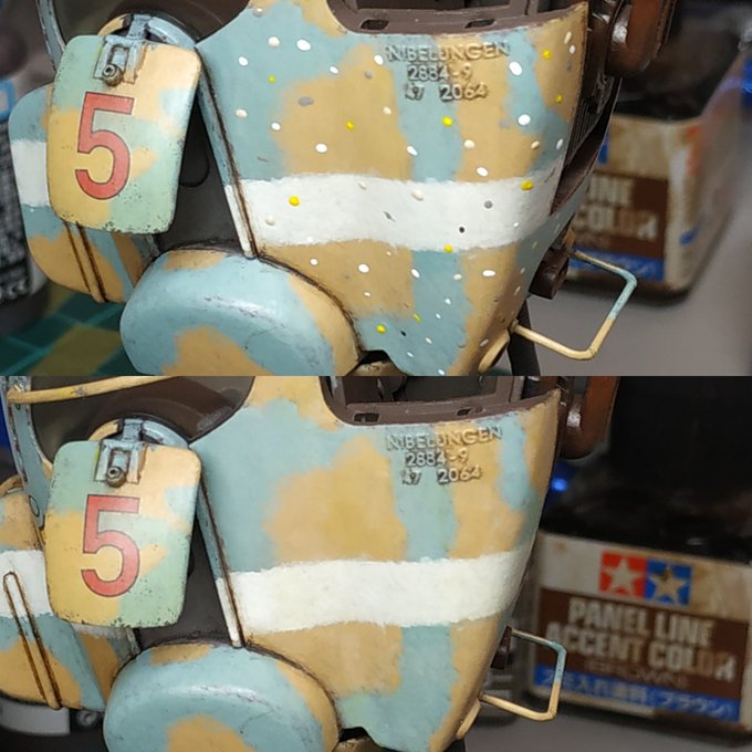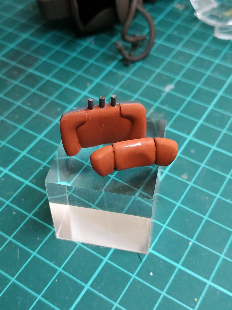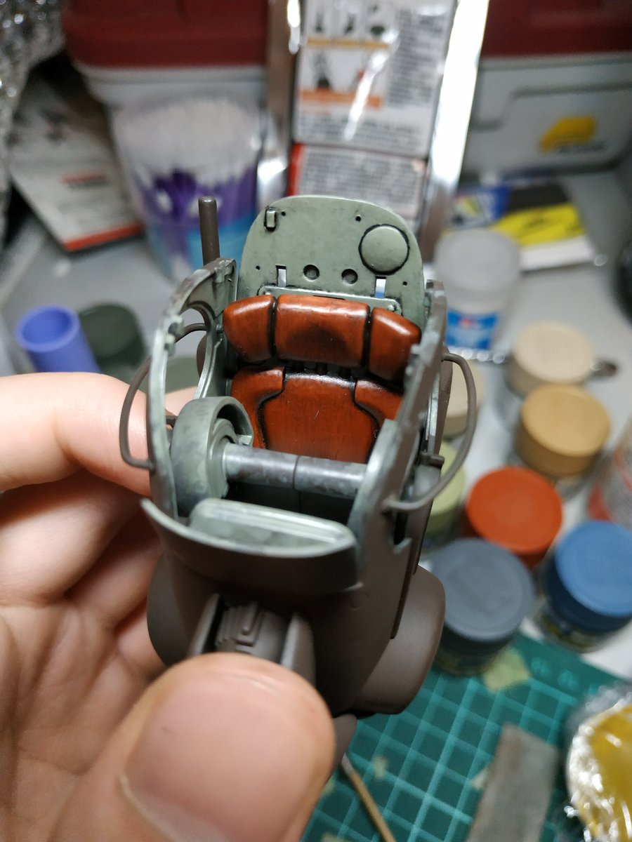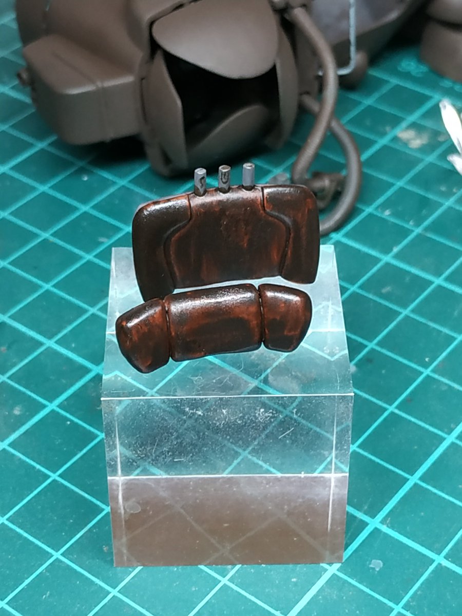 How I usually do leather seats: 1. Mr Color No.7 Brown + Gaianotes flat base 2. Mr Weathering Color Ground Brown 3. Wipe off excess with cotton bud Honestly could use some improvement but it works #マシーネンクリーガー #マシーネン #筆塗り