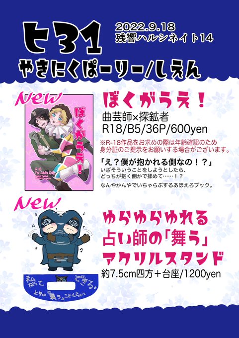 14 41 9/18イベントお品書きです!不備がなければ曲探本がでます!拙いながらも頑張って描きました!よろしくお願いします! 22/09/08 02:27