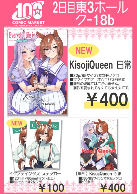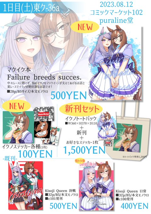 【コミケ #C100お品書き 】 #ウマ娘 マクイク本とイクノステッカーを頒布します! 既刊もわずかですが持っていきます。 2日目、日曜東ク-18bでお待ちしておりますー 通販もありますので、来れない方は是非是非!! 🍈melonbooks.co.jp/detail/detail.…