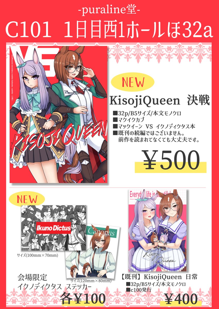 【コミケ #C101お品書き 】 #ウマ娘 マクイク本とイクノステッカーを頒布します! 12/30(1日目金曜)西-ほ32aでお待ちしておりますー 今回はマックちゃんvsイクノちゃん本です…! 委託通販もメロン様で始まっておりますので、来れない方は是非是非!! 🍈melonbooks.co.jp/detail/detail.…