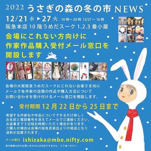 27日まで開催中です! #うさぎの森の冬の市 阪急うめだ本店 うめだスーク 中央街区 1、2、3番小屋 画像を送っていただきました。 引き続きよろしくお願いします😊 #阪急うめだ #羊毛フェルト