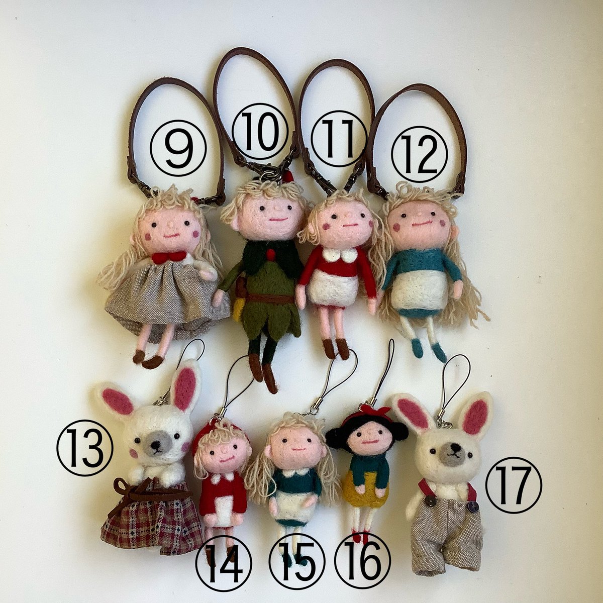 「 #うさぎの森の冬の市」 12月21日~27日 阪急うめだ本店 うめだスーク 中央街区 1、2、3番小屋 通販ご希望の方は画像を添付し @AMULETomise へDM またはメールにてご連絡下さい。 ⑨~⑫マスコット人形 約11cm~13cm ⑬~⑰ストラップ 人形約9cm うさぎ約11cm #羊毛フェルト