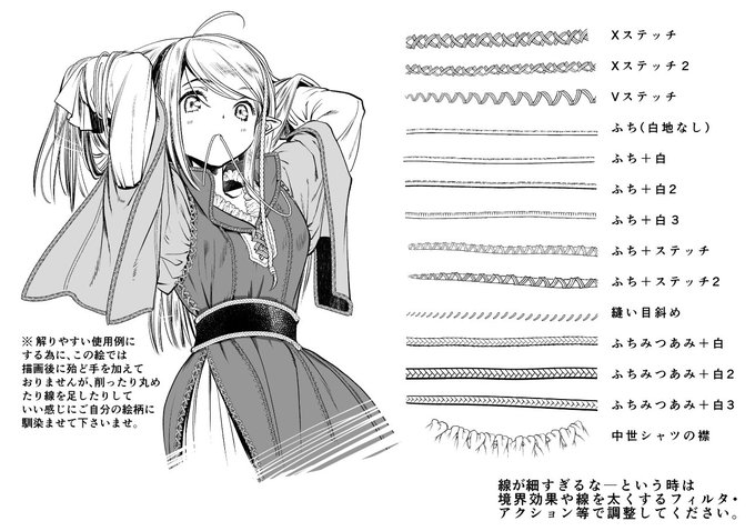 こんばんはお久しぶりのブラシ職人です。イラスト一枚なら楽しいんだけど漫画だとなんかもうイーーー!!!てなる代表格、中世やファンタジーの衣装の端っこをアレするブラシをお出ししていますので心安らかに異世界へ挑んでくださいませ無料です。 assets.clip-studio.com/ja-jp/detail?i… #clipstudio