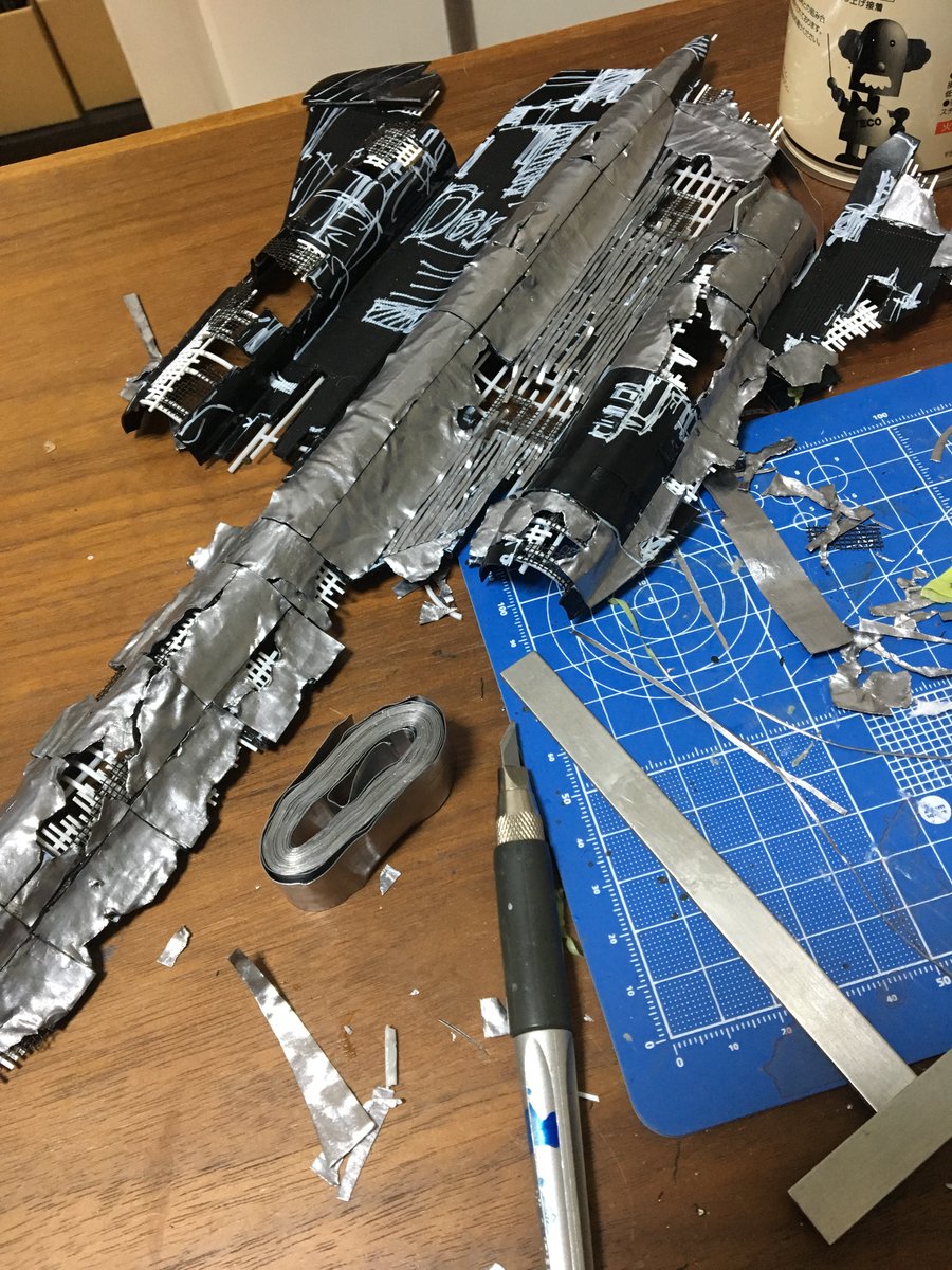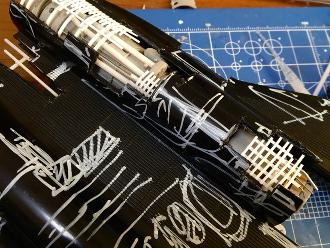 ファルケ改修その2。ハセガワキットのバルカン砲は凄く力強くてカッコいい。ただ個人的にはファルケのバルカン砲は強さより精悍さ。キットだと約2mm経の砲身は1.5mmプラ棒で作成。他パーツはキットパーツのサイズそのままでプラ板工作。シュッとしました。 #マシーネンクリーガー