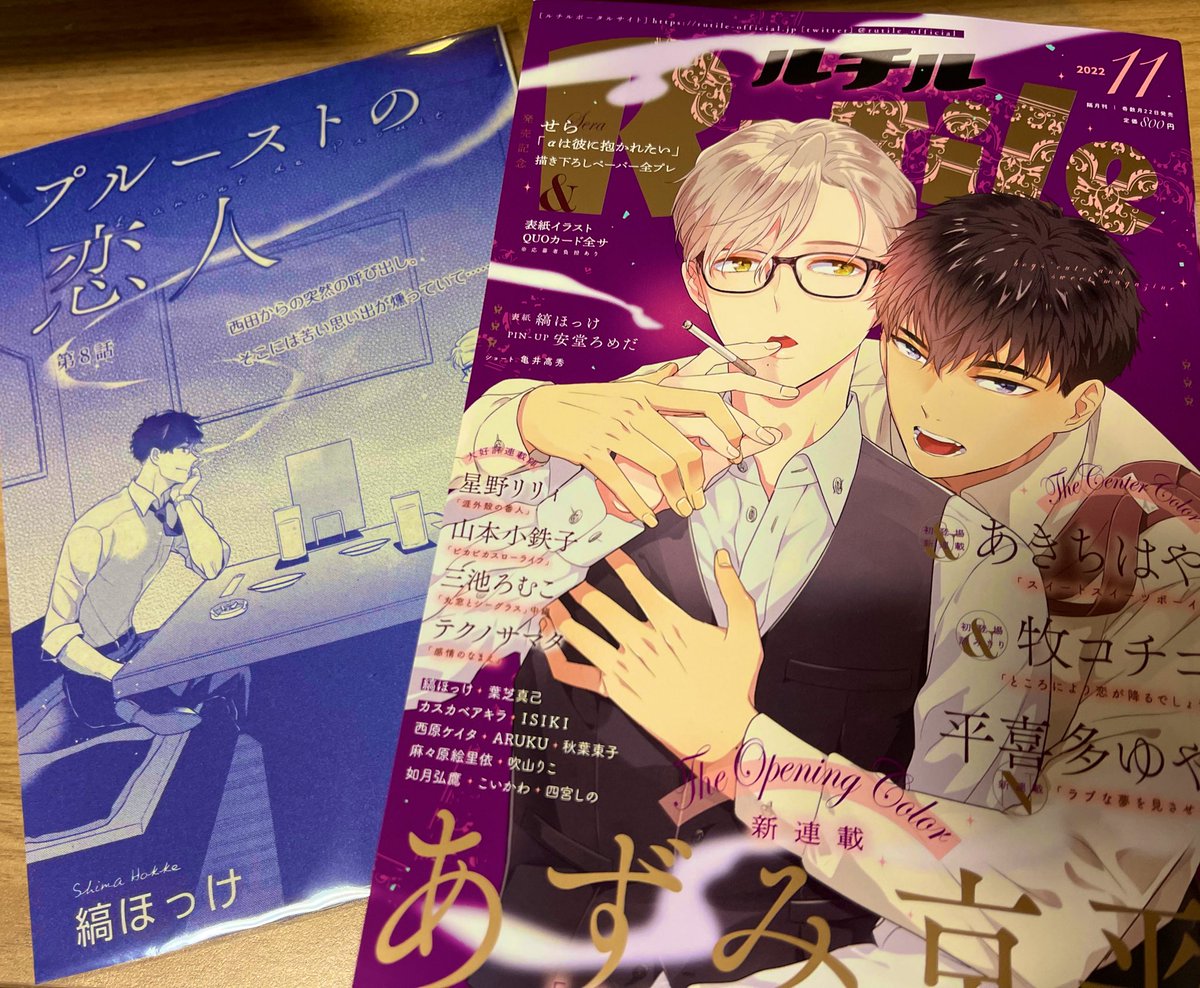8 44 9/22発売のルチル11月号にぷるーすとの恋人8話載ってます!表紙も描かせて頂きました!金インク(?)と赤みの紫がシックでとても綺麗😭✨よろしくお願いします〜! 22/09/21 19:52