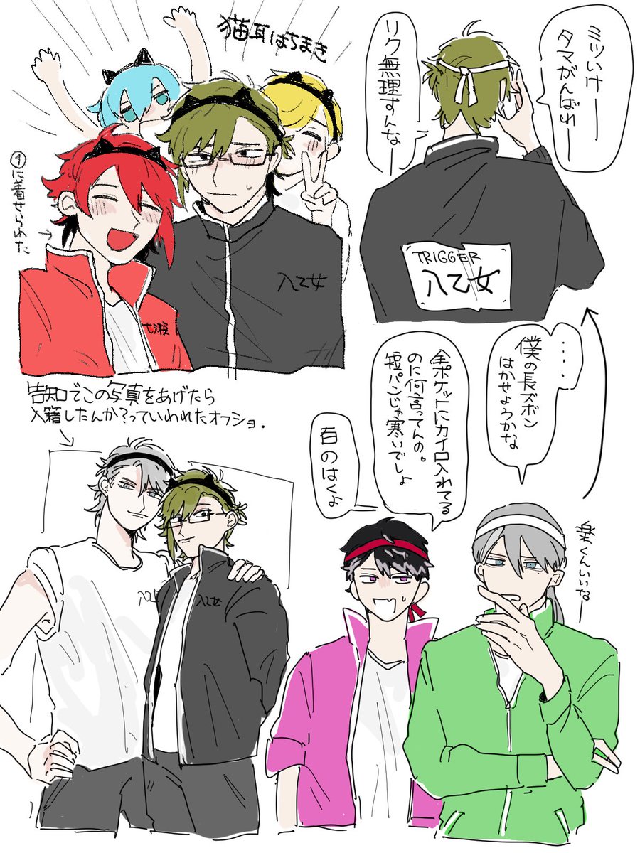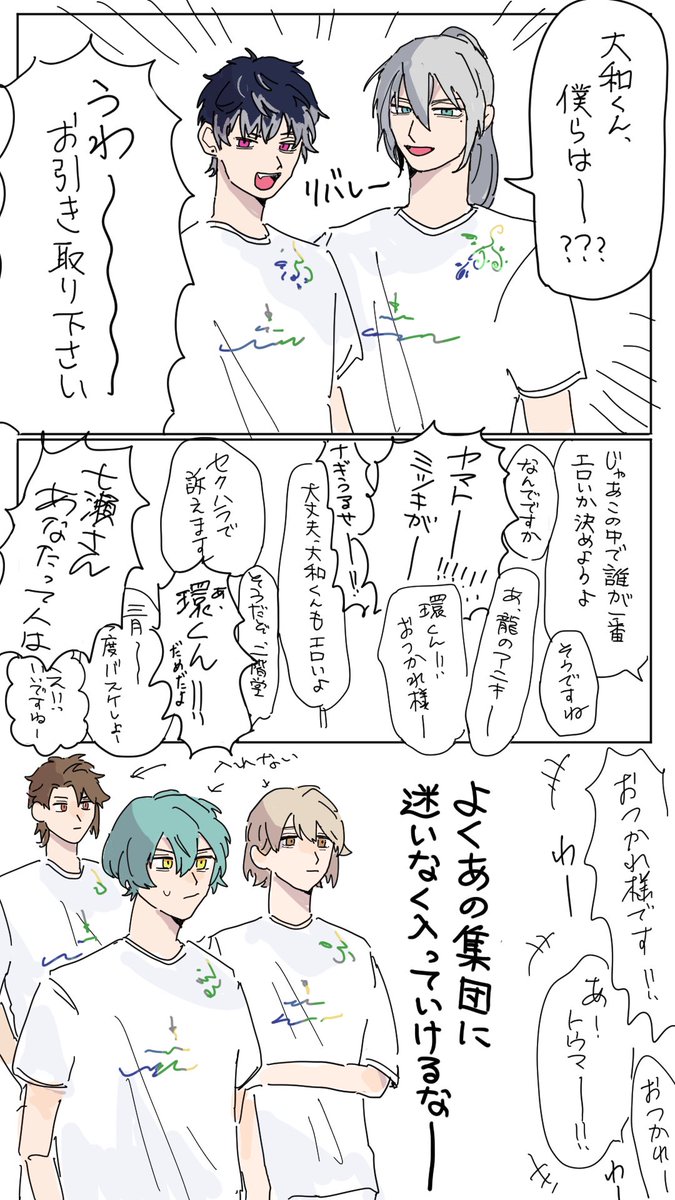 運動会バラエティでニカヤマがまさかの長袖短パンというかわい子ちゃんの格好をしていて、しかもその長袖に「八乙女」って描いてあって生きとし生けるものに感謝を送りたいフォロワのツイートをお借りした映画部です。ほとんど22歳組。ほんのり楽ヤマ。