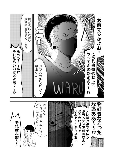 気弱な小学生、チンピラに掃除を邪魔されてしまう…⁉️👦😈2/3 #漫画が読めるハッシュタグ #悪山くんとたかしちゃん