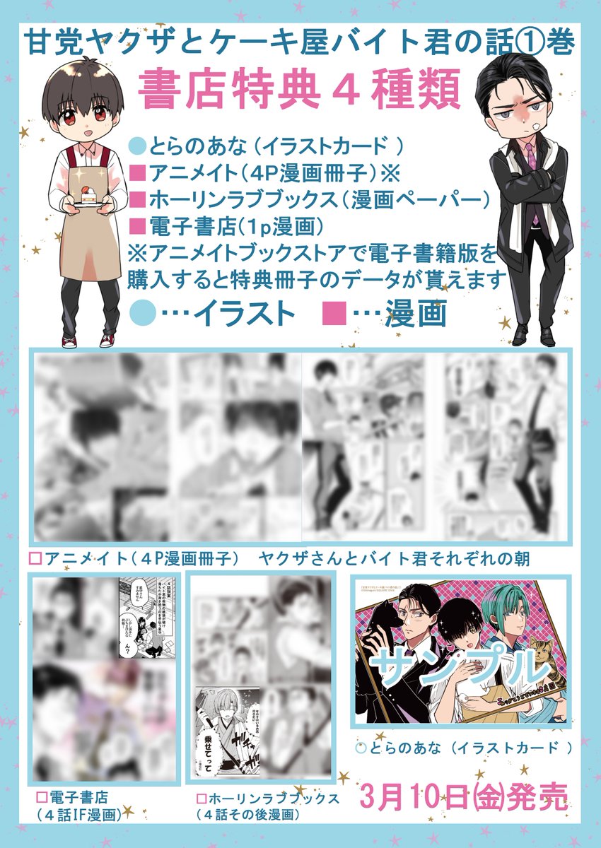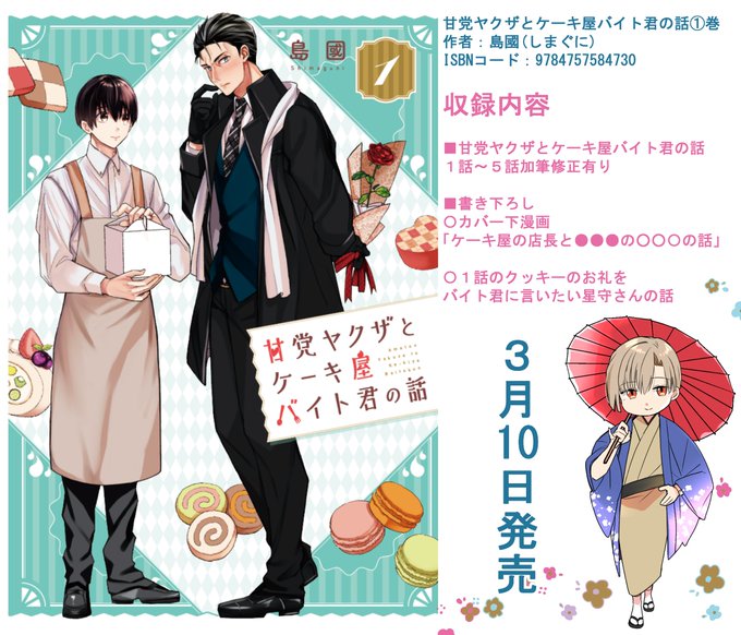 🍰単行本発売のお知らせ🍰 甘党ヤクザとケーキ屋バイト君の話 単行本①巻がスクウェア・エニックスより3/10に発売します(紙・電子)書店特典も4種類描きました。 ご予約の際は書店さんにISBNコードをお伝えいただくとスムーズです magazine.jp.square-enix.com/top/event/deta… #創作BL #商業BL