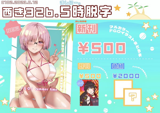 あなたのサークル「5時脱字」は、コミックマーケット102で「土曜日 西地区 “き” ブロック 32b」に配置されました!コミケWebカタログにてサークル情報ページ公開中です! webcatalog.circle.ms/Perma/Circle/1… #C102WebCatalog FGOイラスト本です!!よろしくです!!