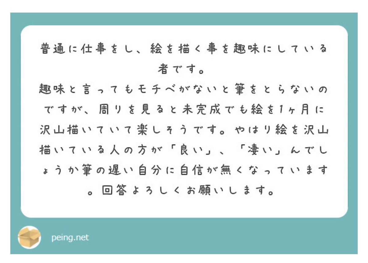141 623 趣味は人によって求めることがバラバラなので、不用意に他と比べないことが大切なのかなと僕は思います。絵の枚数も、筆を取るタイミングも、自分のリズムで全然良いと思います。自分が楽しめることを第一に続けて行くのが良いのかなと思います。 23/07/13 15:56