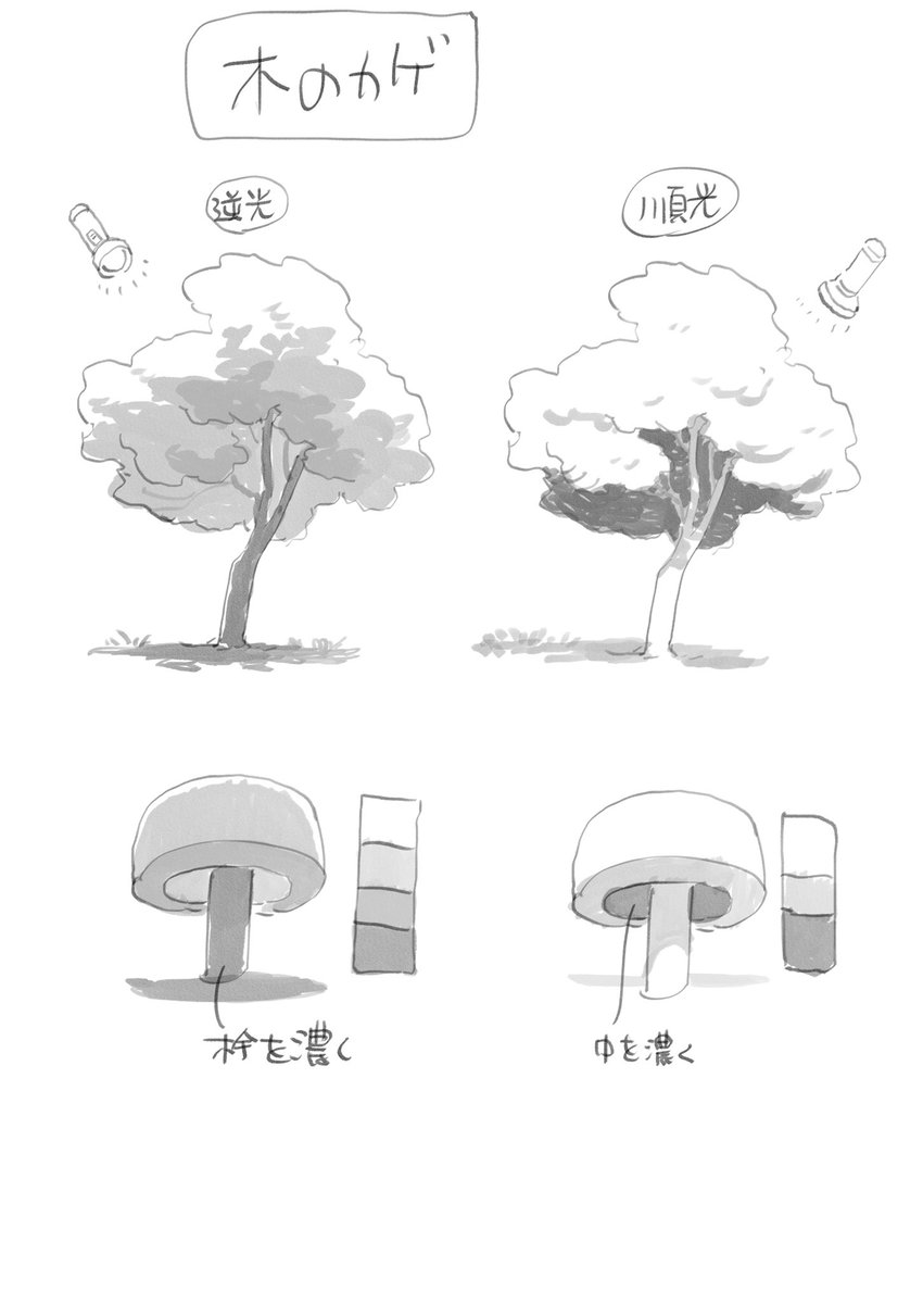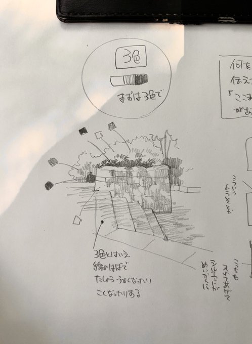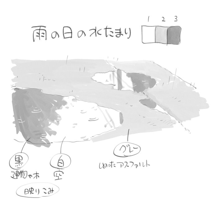 白、黒、グレーの三色ベースで描くと濃淡が整理されていいな。