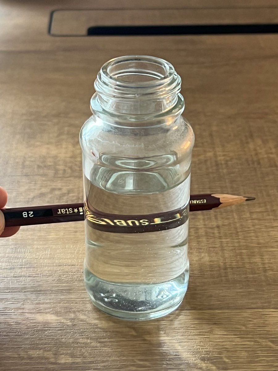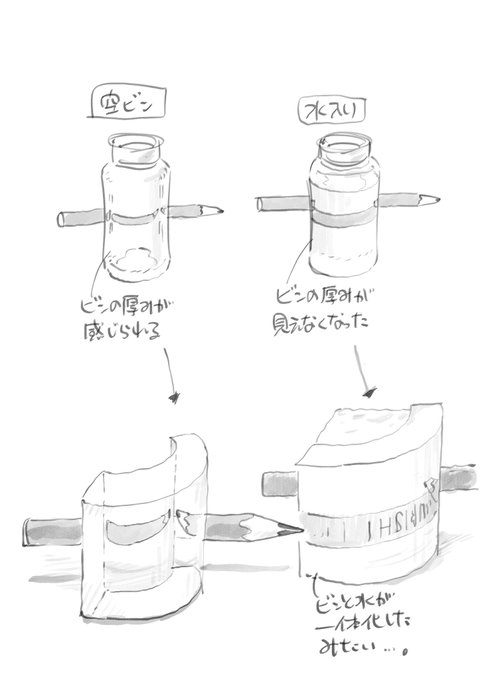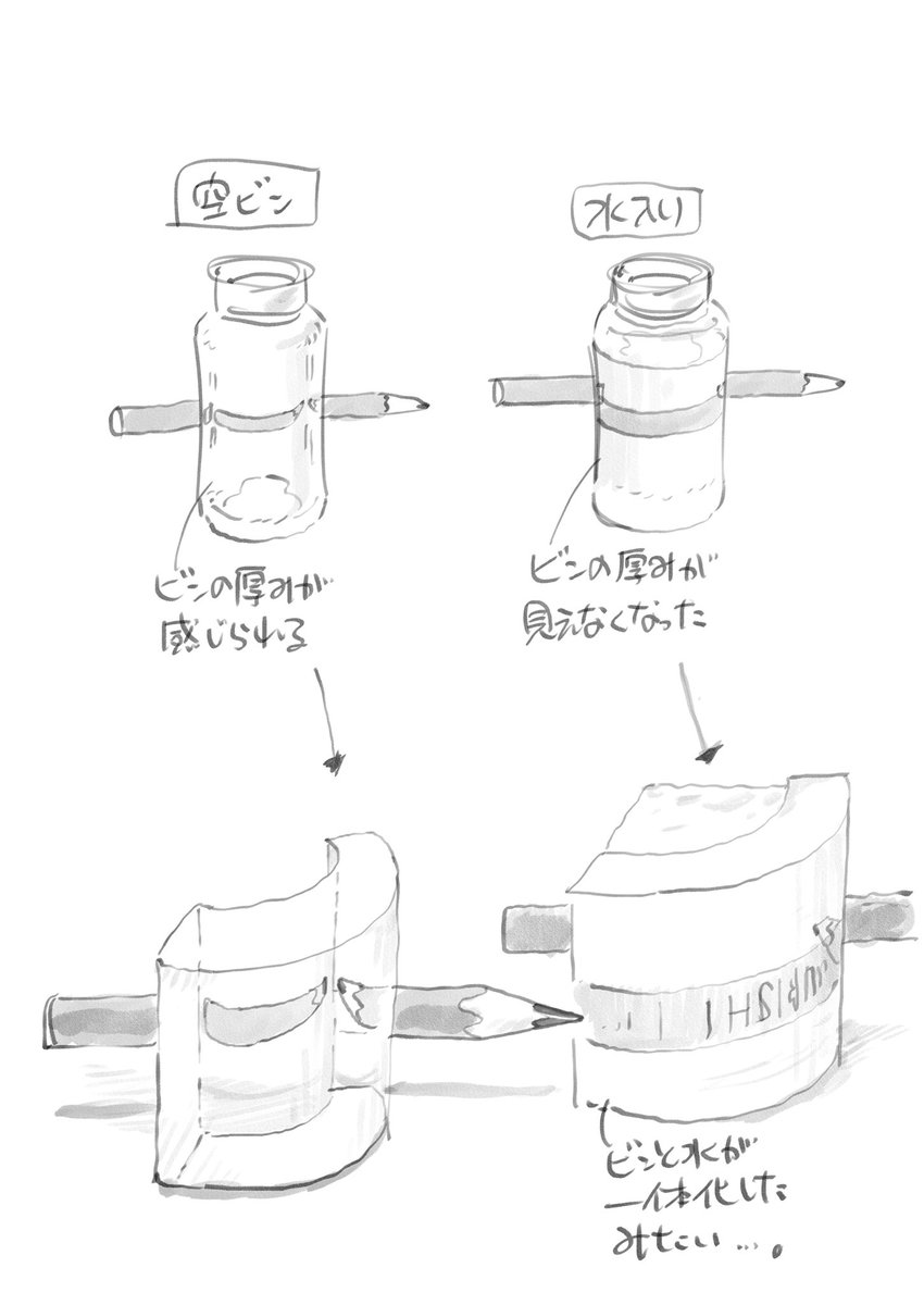 空のビンはガラスの厚みが分かるけど、水の入ったビンは厚みが分かりにくい。
