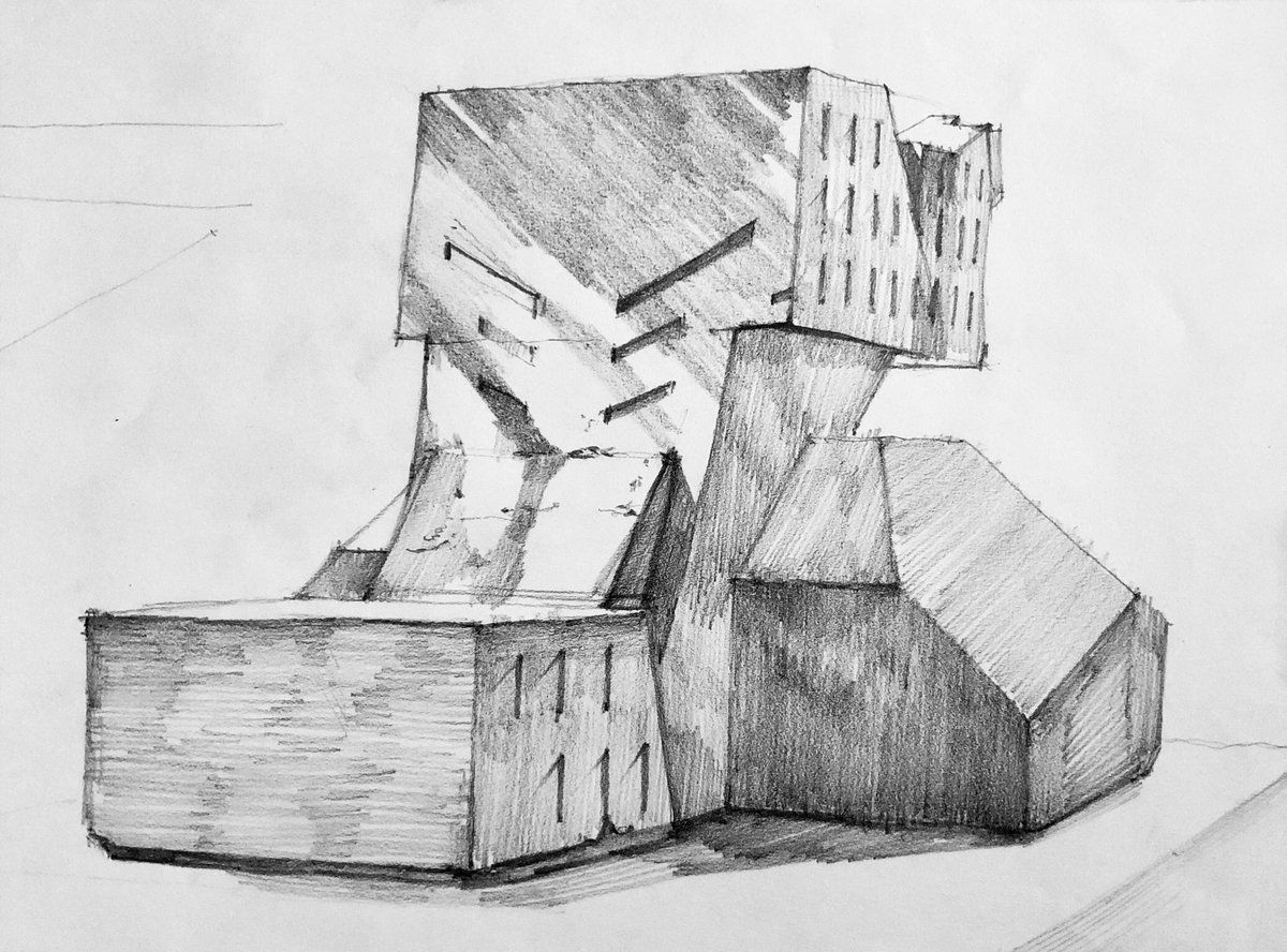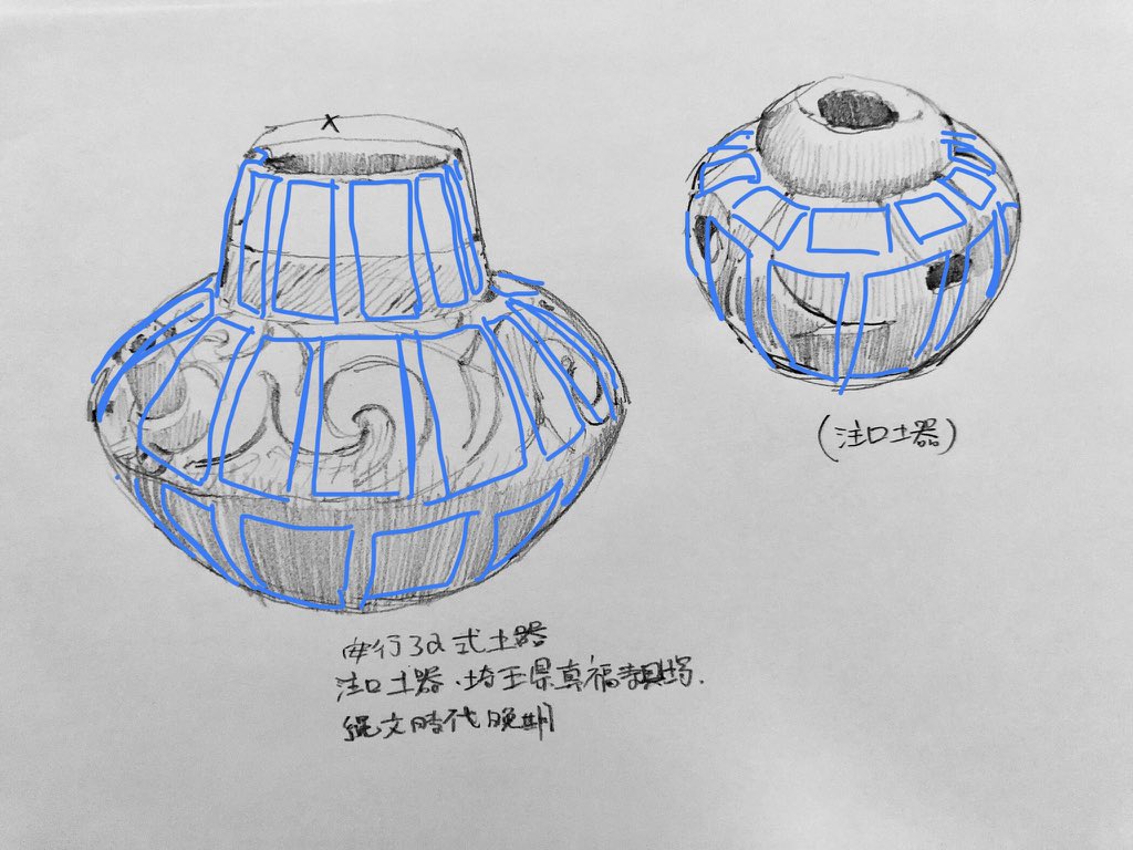 スケッチの中でこういった補助線は使いませんが、頭の中では常にこの線のような面の向きをイメージしながら描いています。