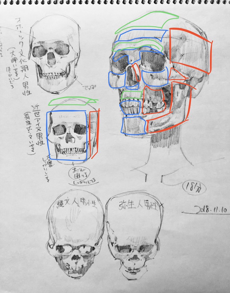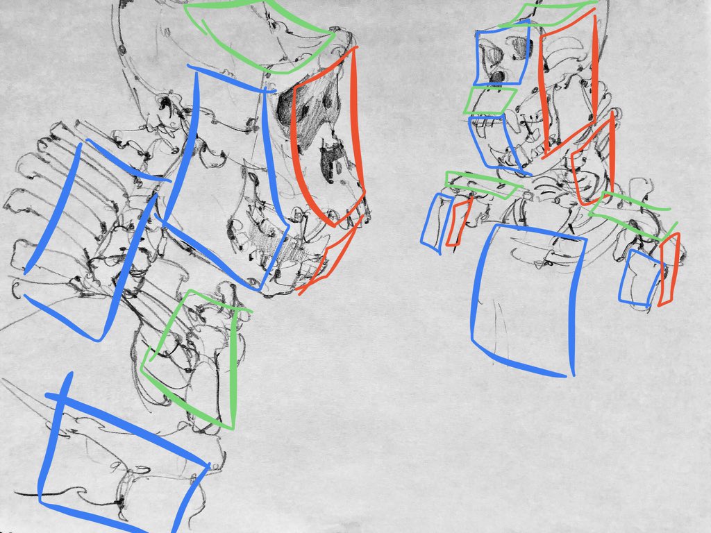 【面を把握する】 物体は面で構成されている。描く時は面を把握すること。ブロッコリーはツボミが複雑に見えるが面で見ると実は簡単。面さえ分かればそこにじっくり描き込むだけ。肋骨も面がある。そこに沿って骨を並べるだけ。その面がどの方向を向いているか把握できると画力が上がる。