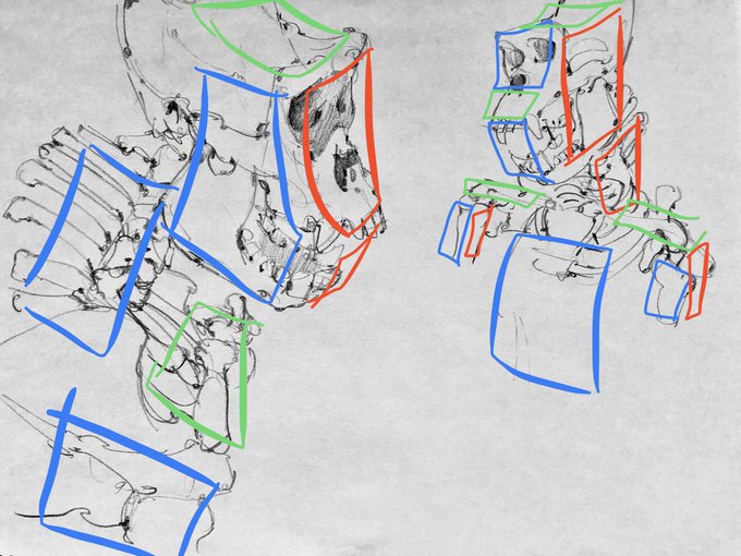 197 1816 【面を把握する】 物体は面で構成されている。描く時は面を把握すること。ブロッコリーはツボミが複雑に見えるが面で見ると実は簡単。面さえ分かればそこにじっくり描き込むだけ。肋骨も面がある。そこに沿って骨を並べるだけ。その面がどの方向を向いているか把握できると画力が上がる。 23/06/30 19:36