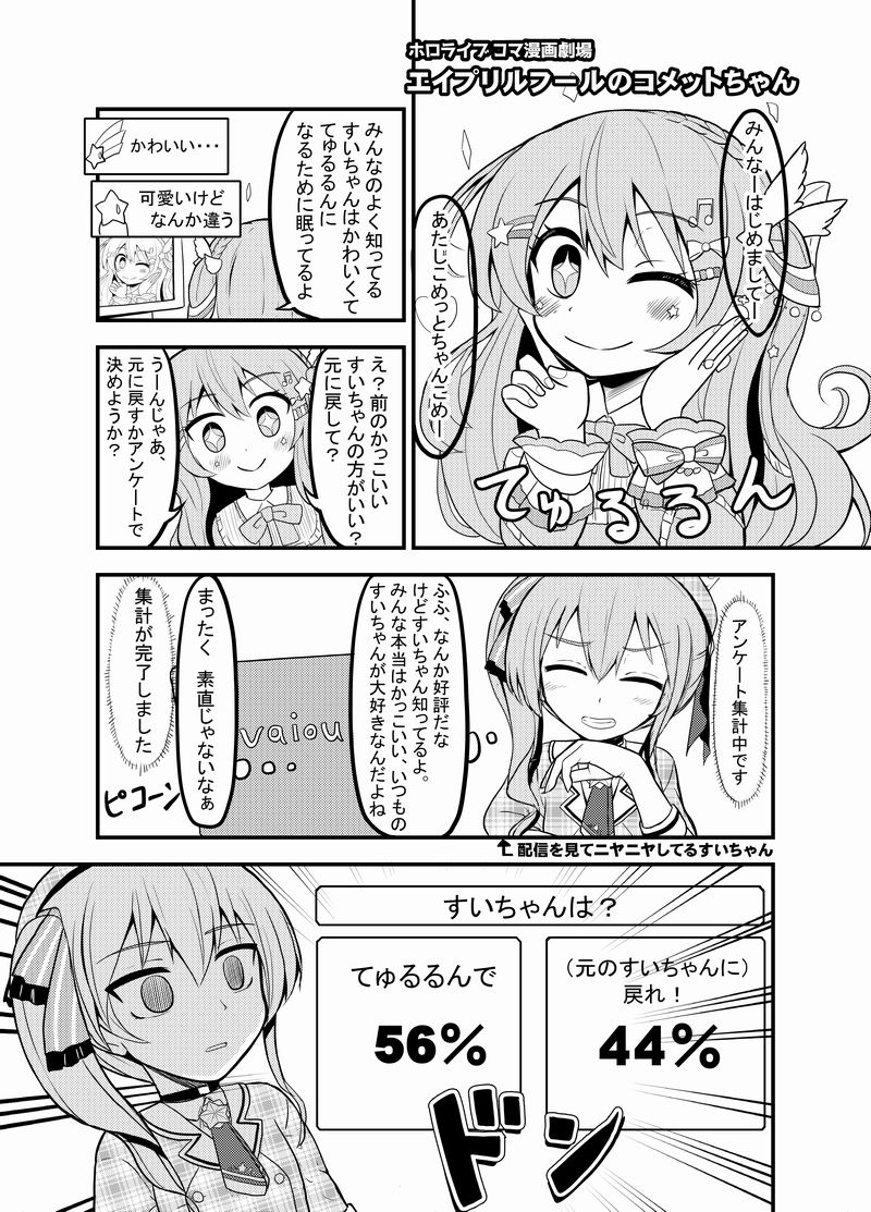 エイプリルフールのコメットちゃん【ホロライブコマ漫画劇場32】 ちなみに私は「てゅるるん」に入れました。 pixiv.net/artworks/10701… #漫画 #ほしまちぎゃらりー #星街すいせい #コメットちゃん