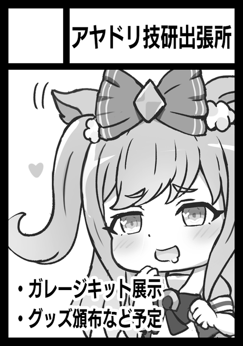8/12の夏コミ一日目のお品書きです。スペースは東シ16b『アヤドリ技研出張所』 りくさん(@ri_ku_n)といつものウマ娘ガレージキット展示もします。 新作はデジたんグッズ、本は間に合えばあるかもぐらいの感じです。よろしく!! #C102 #アヤドリ技研