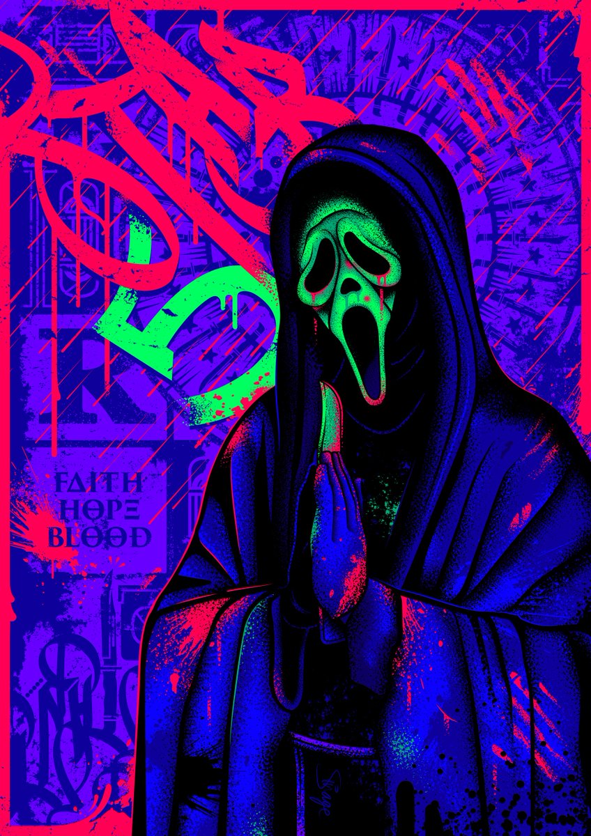 The cult of Ghost face is joining the urban black light party bloodbath for Stab 5! ๐ฑ๐ฉธ๐ก๏ธ๐ Big Thanks to @rikiege for the invite to #TheStabArtProject ๐ค #Scream6 countdown @hello_sidney @Scream_Spain
