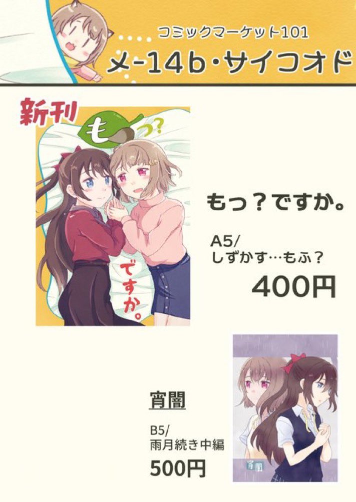 C101新刊 「もっ?ですか。」A5/400円 休みの日にかすみちゃんを自分の家に誘ったしずくちゃん。しずくちゃんが家の前でかすみちゃんを待っていると、かすみの声がして振り返ると、そこには…?? (タイトルで察して下さい 🍈さんに委託、お願いしております。⇒melonbooks.co.jp/detail/detail.…