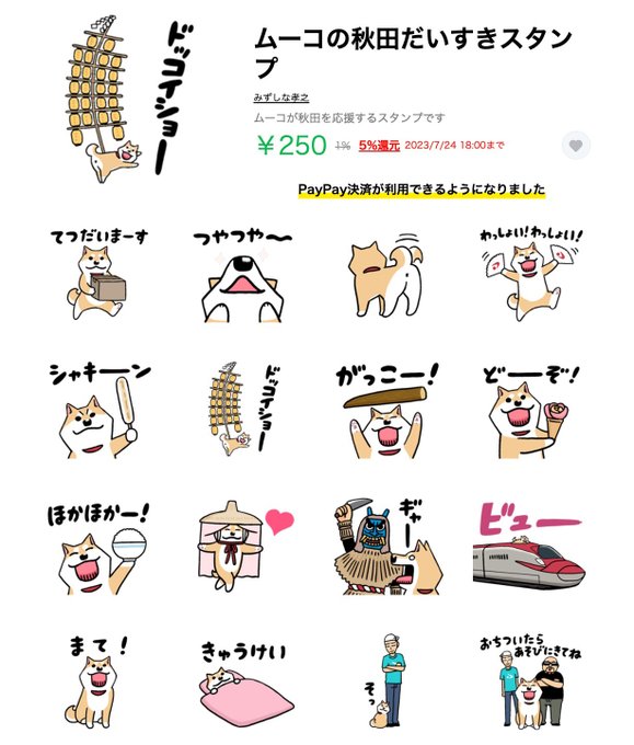 ムーコの秋田だいすきスタンプ、リリースされました。売上はすべて秋田の災害募金的なものに送らせて頂きます(おすすめあったら教えて下さい)。スタンプの収益が入ってくるのは1ヶ月以上あとになるため、それまでは個人的に募金などしたいと思います。 store.line.me/stickershop/pr…