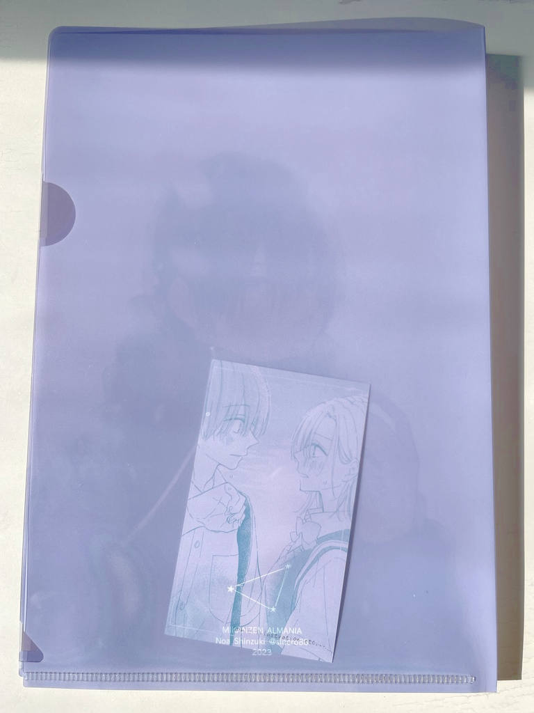 クリアファイル見本。裏は透過仕様なので中に入れたものが見えます(見本用に名刺入れてみました) ▼通販ページはこちら sincro.booth.pm/items/4551832 #COMITIA143 #コミティア143