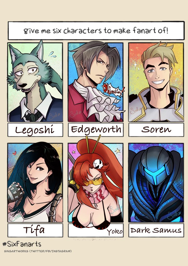 Fb friends selected these characters (and a couple more I’m doodling) #SixFanarts #Legoshi #BEASTARS展 #MilesEdgeworth #gyakutenSaiban #Soren #dragonprince #Tifa #FF7R #YokoLittner #GurrenLagann #Samus #SmashBrosUltimate