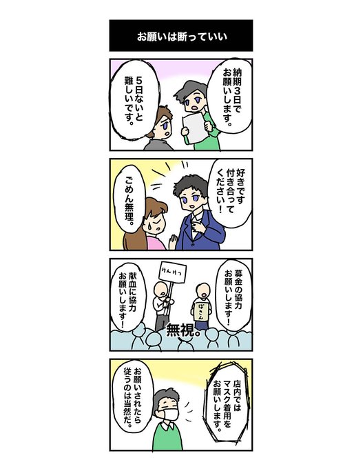 21 65 お願いを強制と勘違いしてる日本人。 でも、実は無意識に断ってるお願いはたくさんあります。やりたくないお願いは断って良いんですよ。 マスク着用のお願いだって同じことです。もうほとんどの場所でお願いはしてませんけどね。 23/07/03 11:03