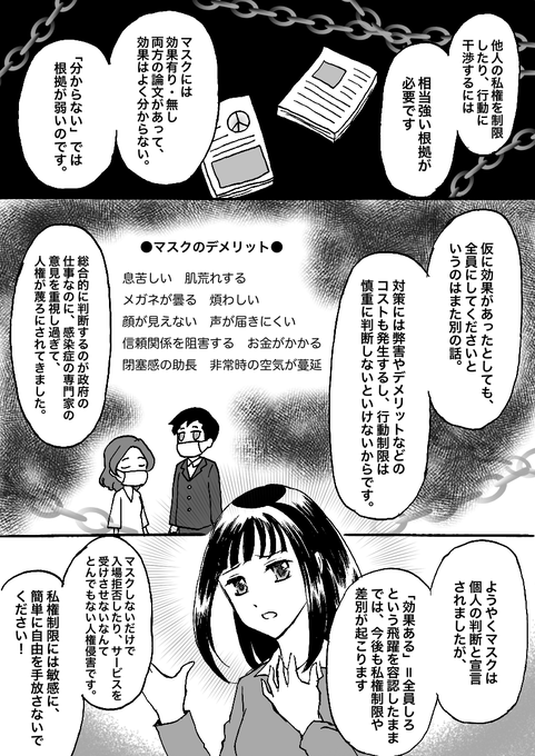 タバコを吸うと肺がんになりやすいのは事実ですが、国民全員に禁煙を強制はできないし、個人の自由ですよね。 事実と価値判断は分けて考えないといけないし、今までもそうしてきました。 マスクに効果があったとしても、全員に着けろというのは全く別の話で、分けて考えないといけないのです。