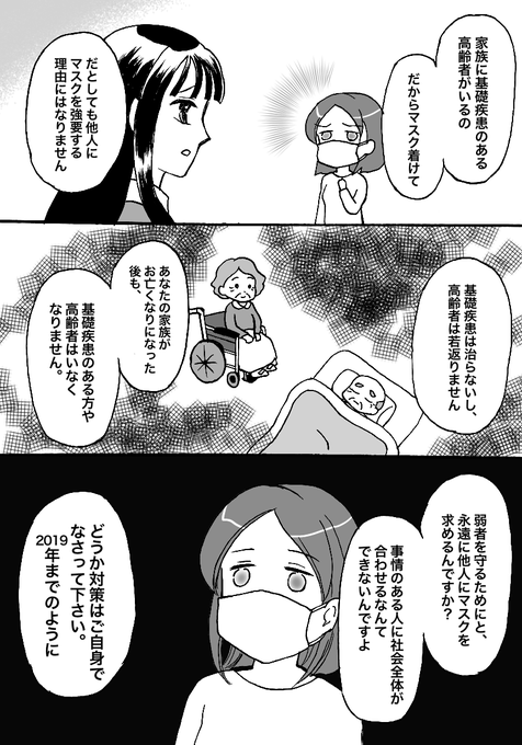 「基礎疾患持ちや高齢者を守るためにマスク」というのはマスクさせたい人や着けたい人が、自分の主張を正当化するために利用してるように感じます。 当事者はそこまでして欲しいとは思われていないのではないでしょうか?どちらかというと周りが良かれと思って他者にも求めてるケースが多いのかも。