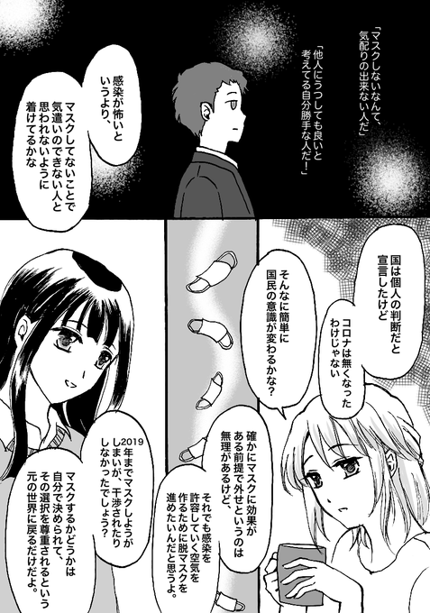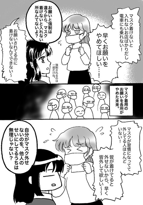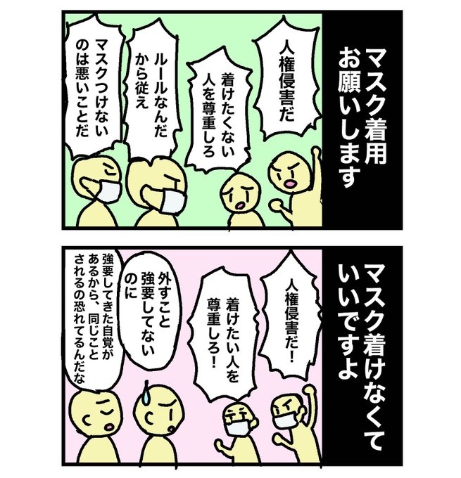 今まで差別され辛い思いをしてきた私たちは、マスク外せと強要したりしません。でも元々マスク警察してた人がマスク外せ警察に転じる可能性はあるでしょう。 つまり、マスク外すことを強要しないでと主張する先は元マスク警察に対してであって、この3年ノーマスクだった人に対してではないんですよ