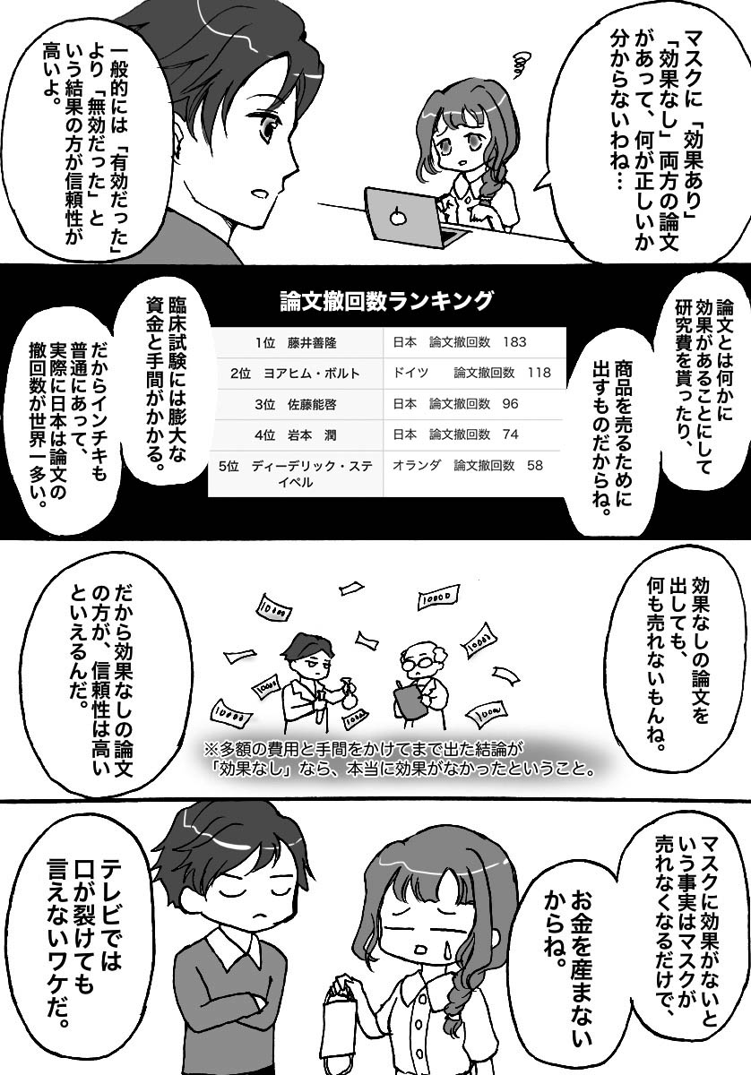 30 79 マスクに感染を防ぐ効果はないけど、感染症ムードを長引かせる効果はあります。マスクの効果を必死にアピールするのは、コロナが続くことで利益を得る人ばかりではないですか? ポジショントークに引っ張られて感染予防効果を信じる人も多数。仮に感染を防げたとしても、いつまで続けるつもりですか? 23/03/31 11:18
