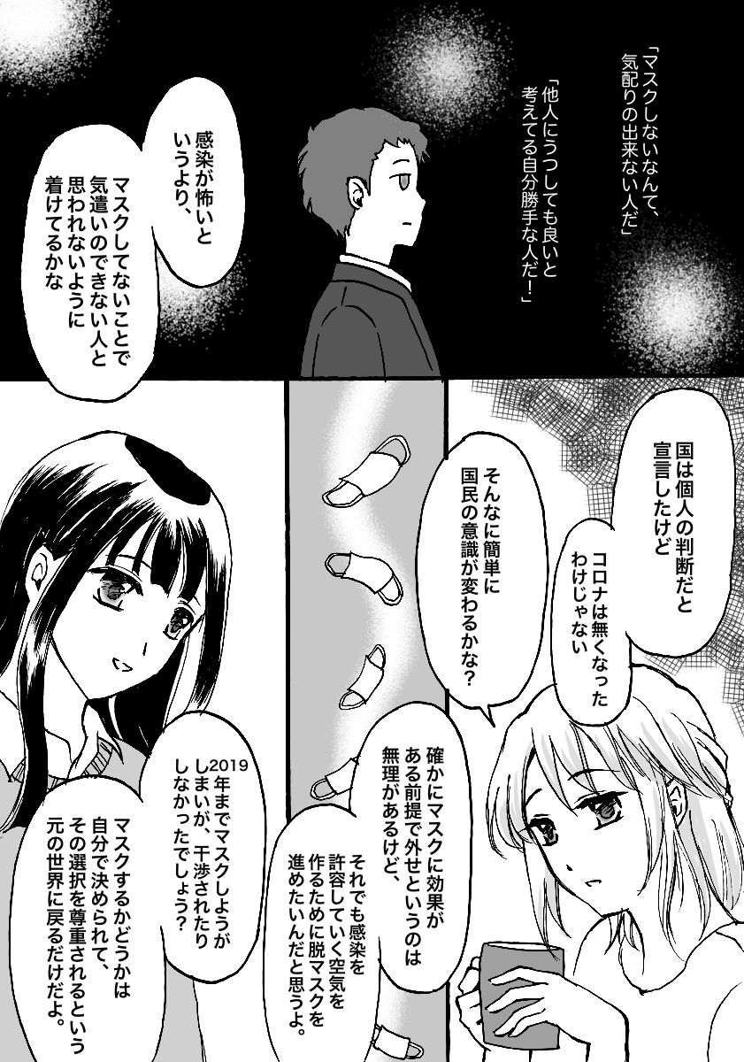 マスクは感染対策というより、ルールだからという理由で着けたり強制したりする方が多くないですか? でも実は守りたいルールを選んでるだけ。結局人の目があるか、皆が守ってるかが行動基準。正しさもルールも不変じゃなく、その時の空気で変わる。 期間限定の正しさを強行的に押し付けて良いの?