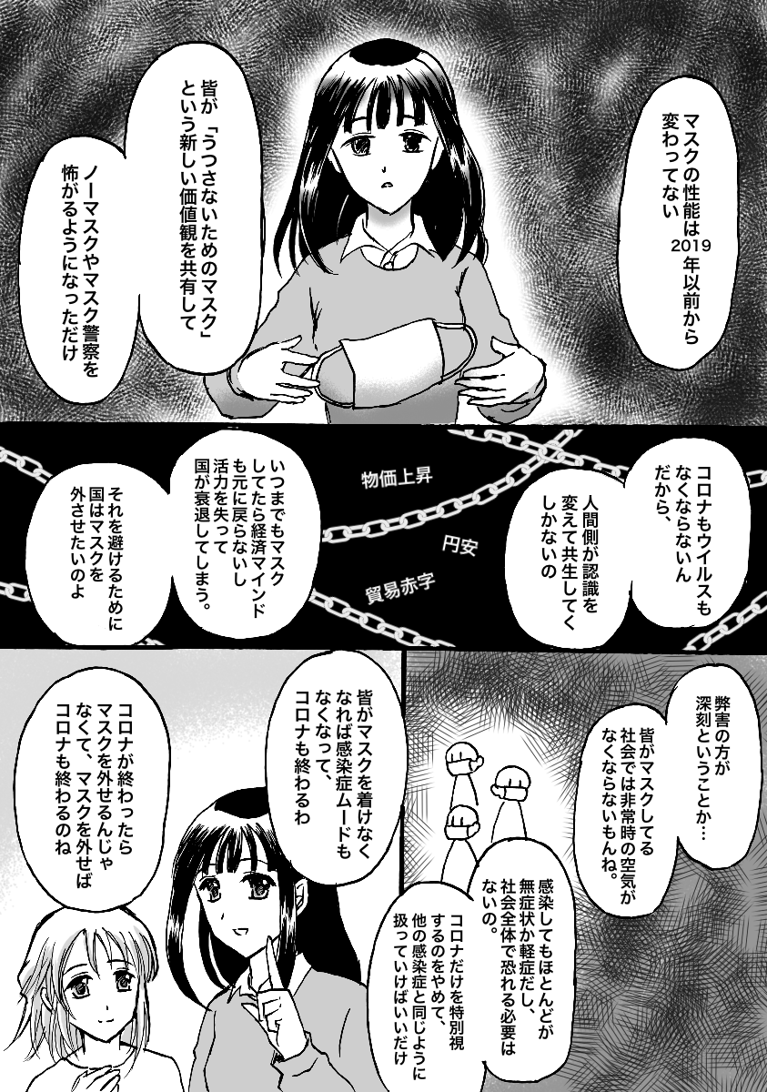 マスクに感染を防ぐ効果はないけど、感染症ムードを長引かせる効果はあります。マスクの効果を必死にアピールするのは、コロナが続くことで利益を得る人ばかりではないですか? ポジショントークに引っ張られて感染予防効果を信じる人も多数。仮に感染を防げたとしても、いつまで続けるつもりですか?