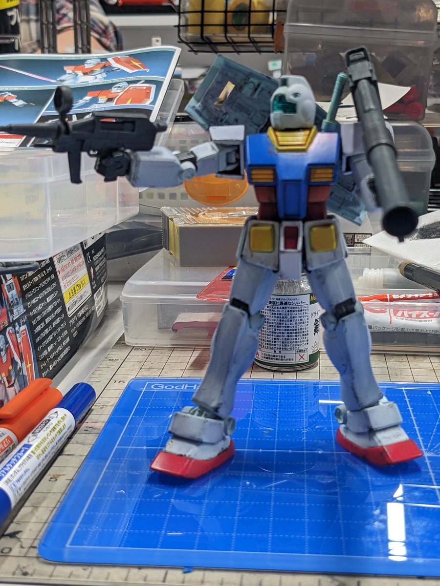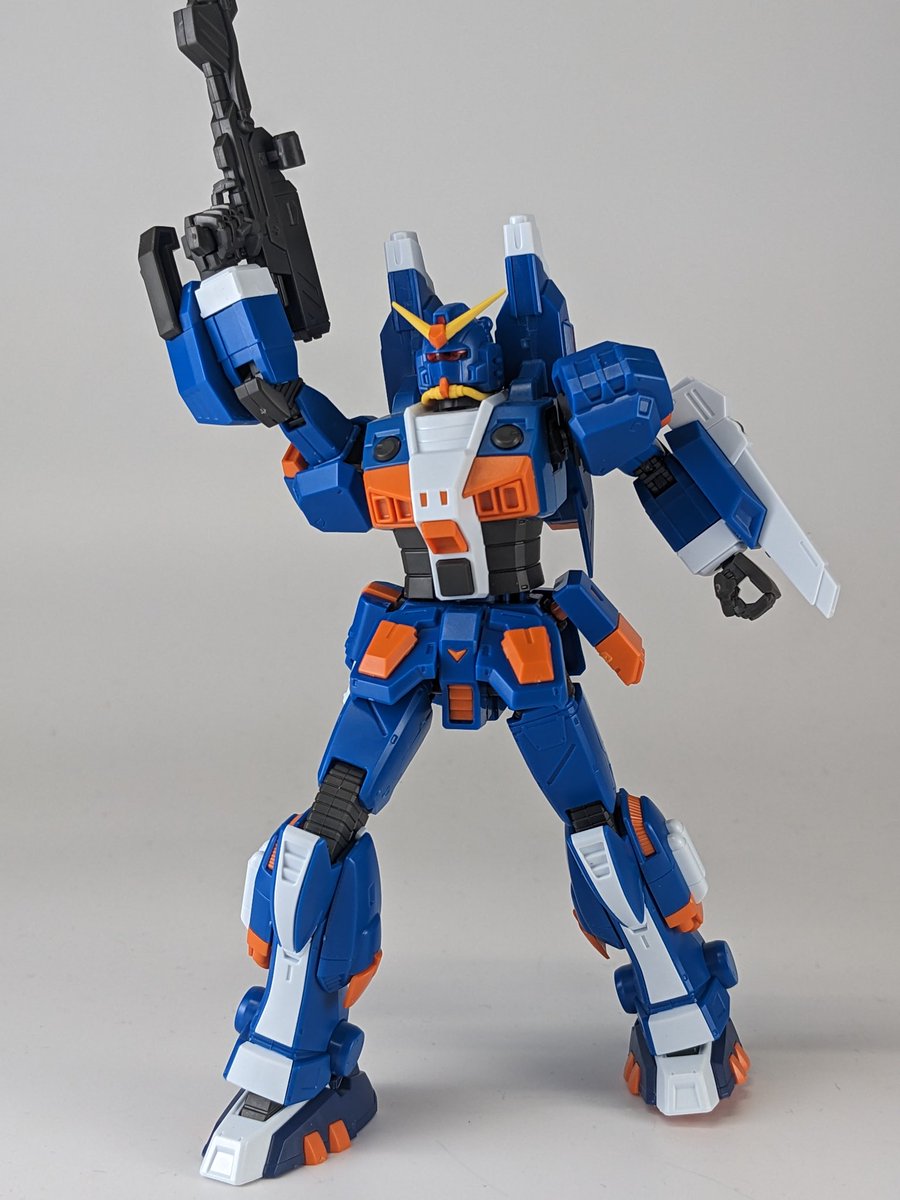 水中型ガンダム、とりあえず素組完成。MGガンキャノンのパーツがバキバキ割れてやる気亡くなったので作りかけで放置してたのを引っ張り出した。土曜の夜なんで有名なポーズ。 #ガンプラ #ガンプラの画像貼るとRTされると聞いて