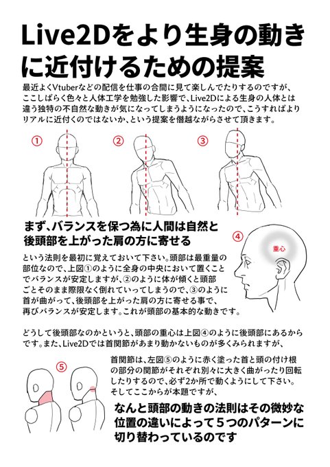 仕事の合間にVtuberの配信などを見ていて、ここしばらく勉強して得た人体工学的な知見から「こうすれば、もっとリアルな人間の動きに近づいて見えるのに」という条件付けが出来ました。 どなたかLive2Dの技術者で暇とチャレンジ精神のある 方、この条件に挑戦してみて下さいませんか?