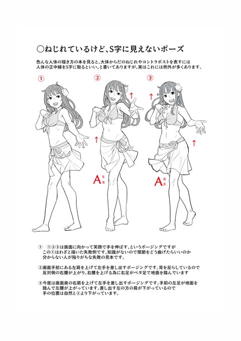 よくイラストの教本に書いてある、人体の正中線をS字に書けばコントラポスト(肩と腰が互い違いに上がる事)になる、という教えには一部不具合があり、信じてると痛い目を見ますよ、というお話。 あと、99パーセントの人が気が付いていない、細かすぎる問題の話です。