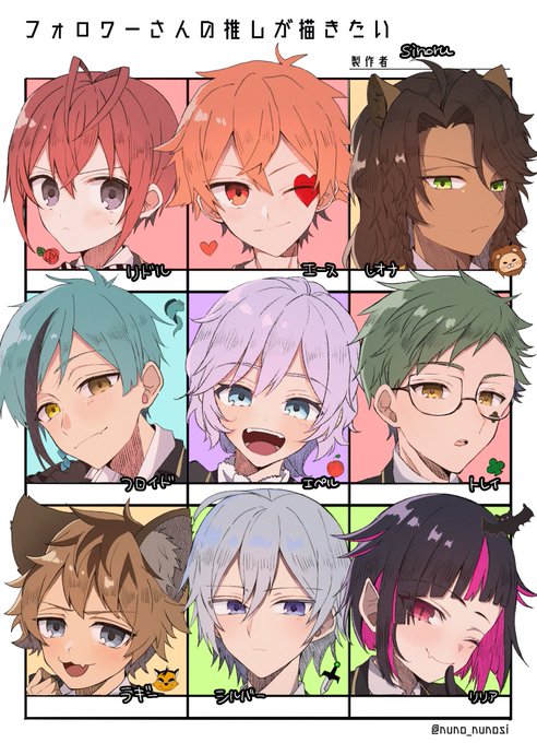 NANAMI さん、オレンジさん、とさめさん、餅デスさんのオリキャラを描かせていただきました! 皆さんとても可愛くてもう満足です!!! また企画やろうかな!!! 本当にありがとうございました😭😭 文字数が危ないのでしのるのイメージが書けん...!!