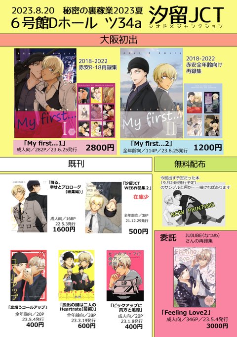 【8/20秘密の裏稼業2023夏】おしながき | シオドメ #pixiv pixiv.net/artworks/11094… インテおしながきです🙌大阪初出しは再録2種です💡 新刊ありません😭9月に発行できそうなので、サンプルと合わせて何か無料配布を置ければと思ってます🙇♀️ なつめさん(@ntm_002)の再録をお預かりしています😃