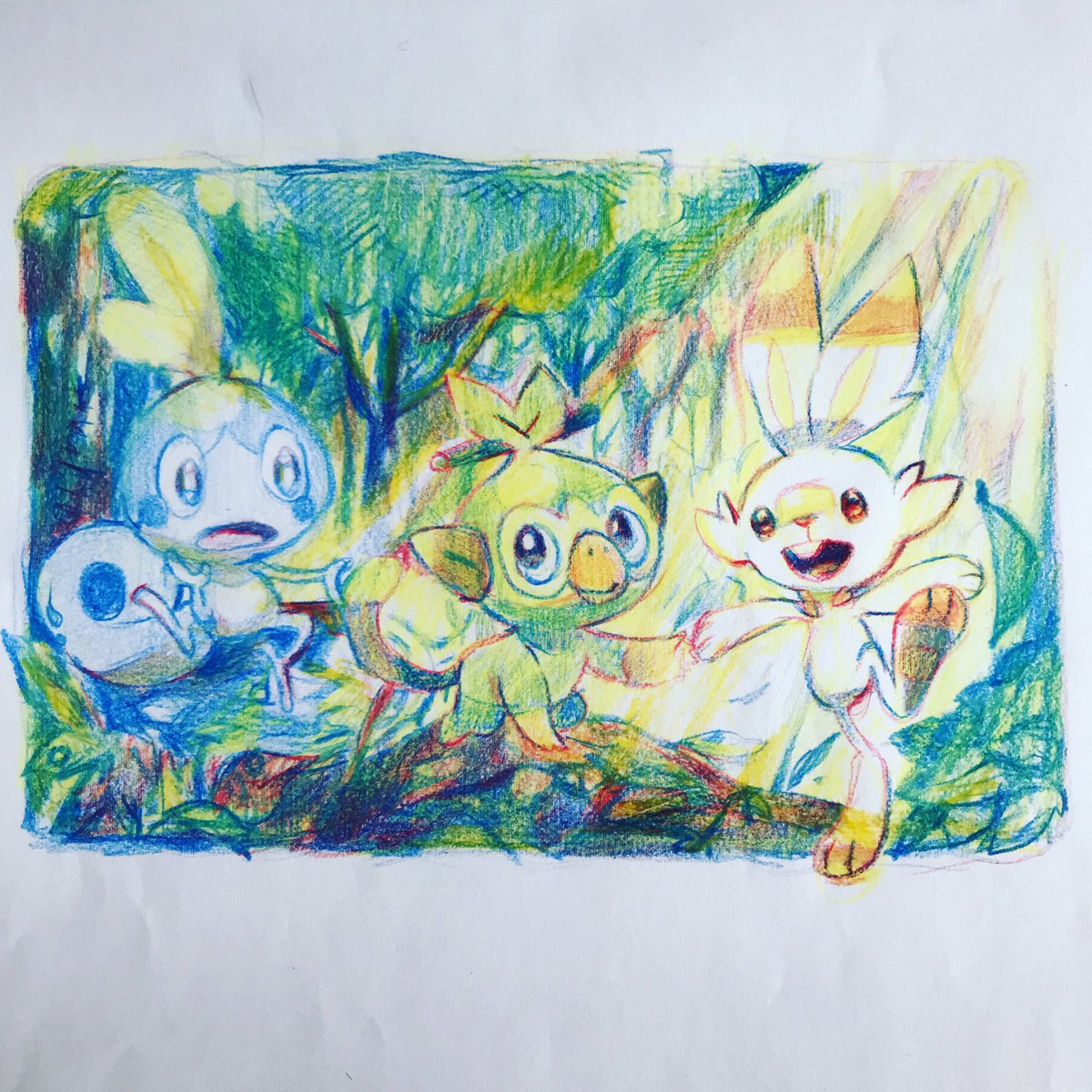 1 19 赤黄青でかいたポケモンです ヒバニーとサルノリとメッソン #ポケモン #色鉛筆 20/04/06 14:26