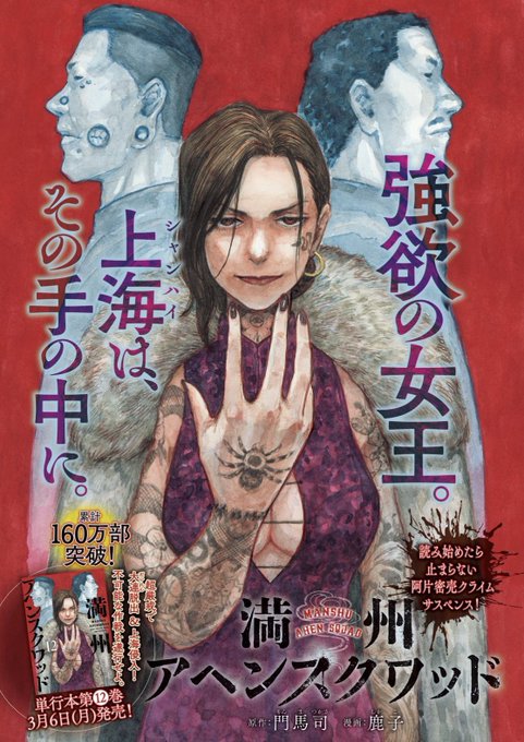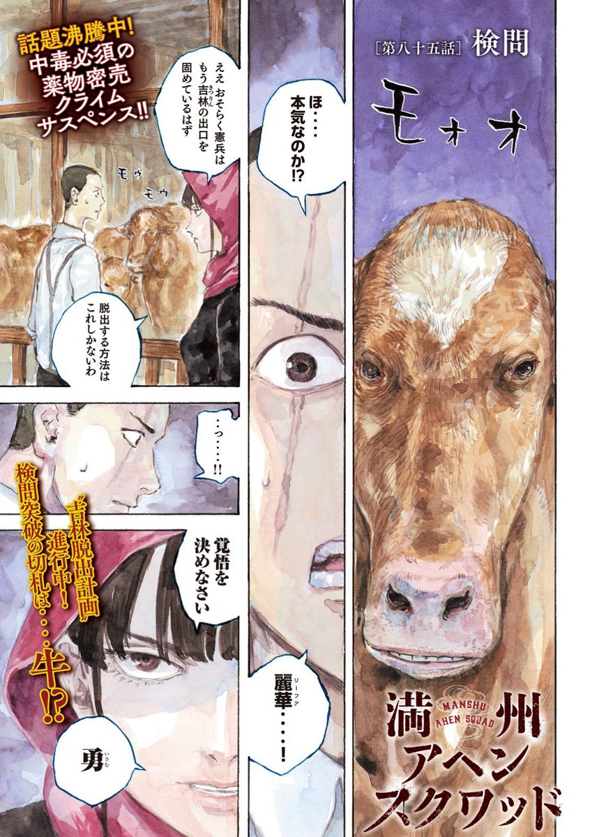 月曜日!ヤンマガ! #満州アヘンスクワッド 70万部突破、ありがとうございますー! 今週は巻頭カラーを頂いています! このカラー、丸3日かかってしまいました。 本編85話「検問」も是非誌面で!よろしくお願いします!