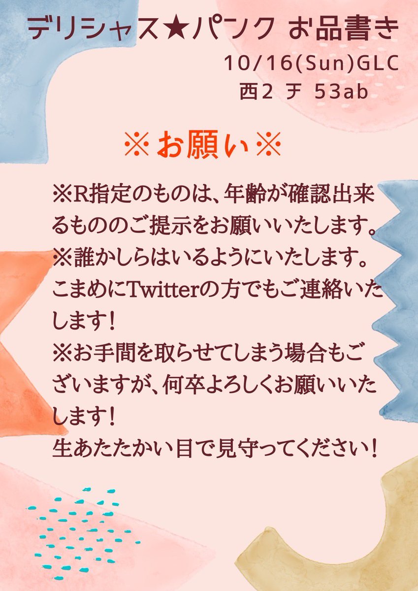 5 9 10/16GLC 西2 チ 53ab お品書きです✨ また、エアスケブ(イラストのみ)も少数受け付ける予定です。キャラ、CP設定シチュは問いません。基本的に何でも大丈夫です。 よろしくお願い致します🙇🏻♀️ 22/10/15 16:08