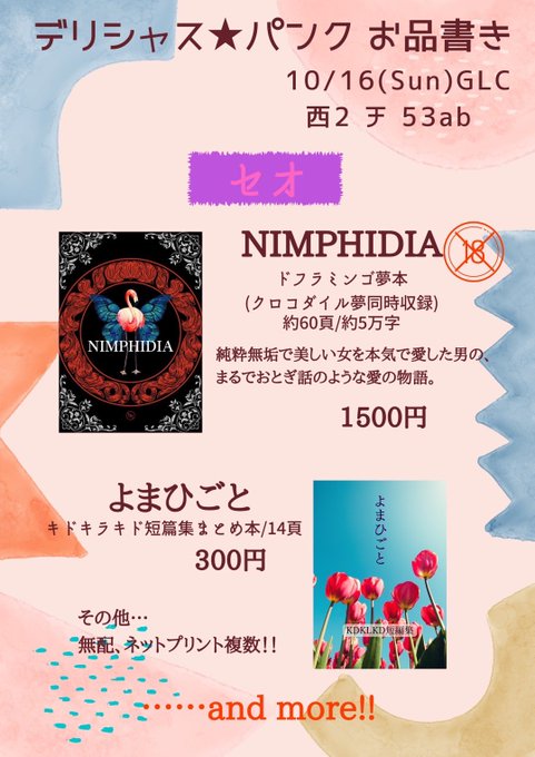 13 76 10/16.GLC26にサークル参加します。 右も左もわからない初心者達(奔放雑食)がとりあえず己の主張を通そうとしたサークルカットがこちらです。 なお全員新刊を落としそうで震えている。 22/08/24 11:51