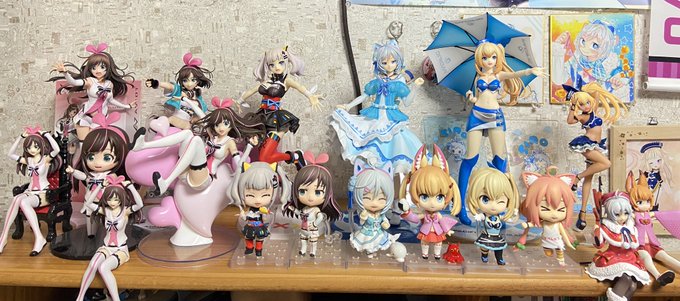 我が部屋のvtuber四天王ゾーン アカリちゃん新しく届いたので少しレイアウトを変更して陳列 写ってるだけで総額が結構やべぇのよ。 #MySiro #KizunaAI #ミライアカリ #輝夜月 #けもみみおーこく